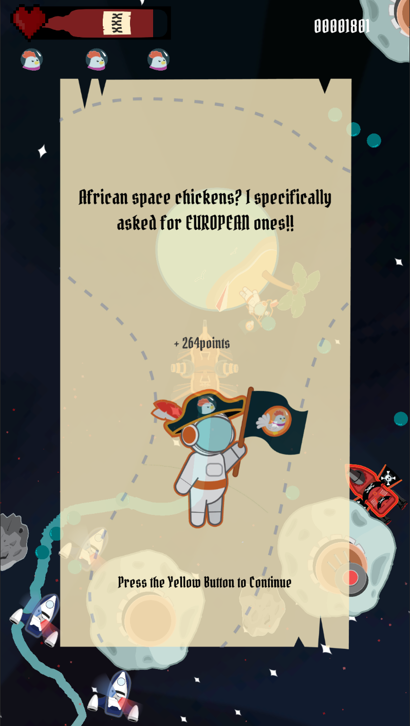 Cosmic Courier is a co-op arcade game where players have to work together to control a spaceship and survive for as long as possible. There are 3 roles for players to choose between, the navigator who steers the ship, and 2 gunners each controlling the left and right cannon. The arcade cabinet is fitted with a real steering wheel and firing controls to make the game experience even more immersive.